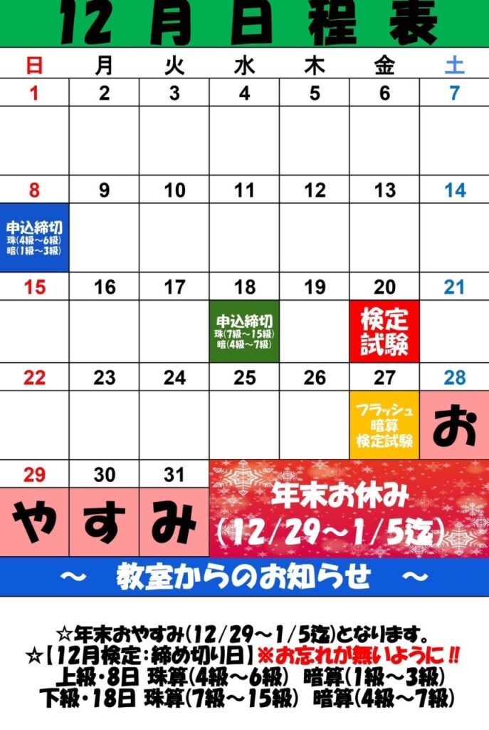 【 令和6年12月日程表 】